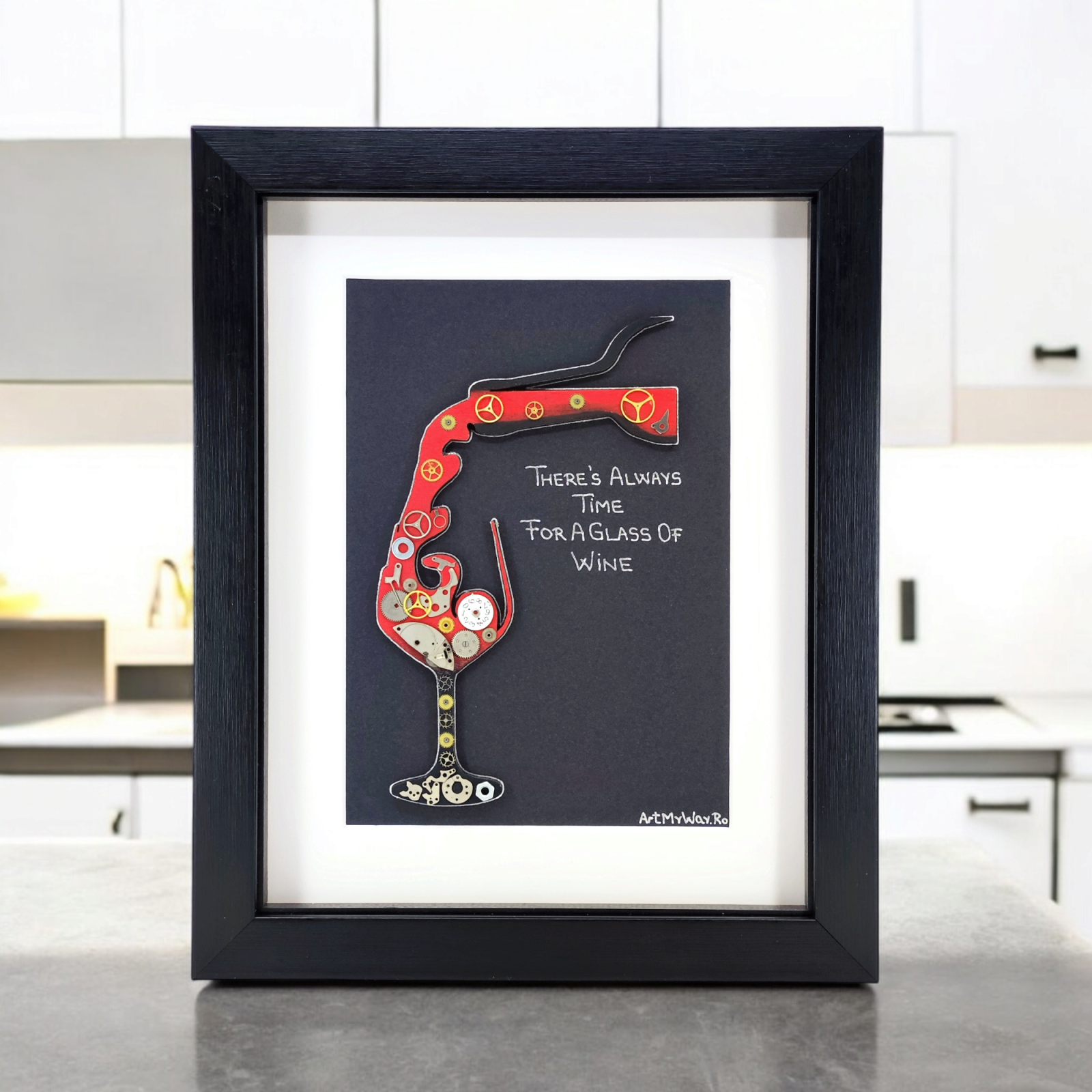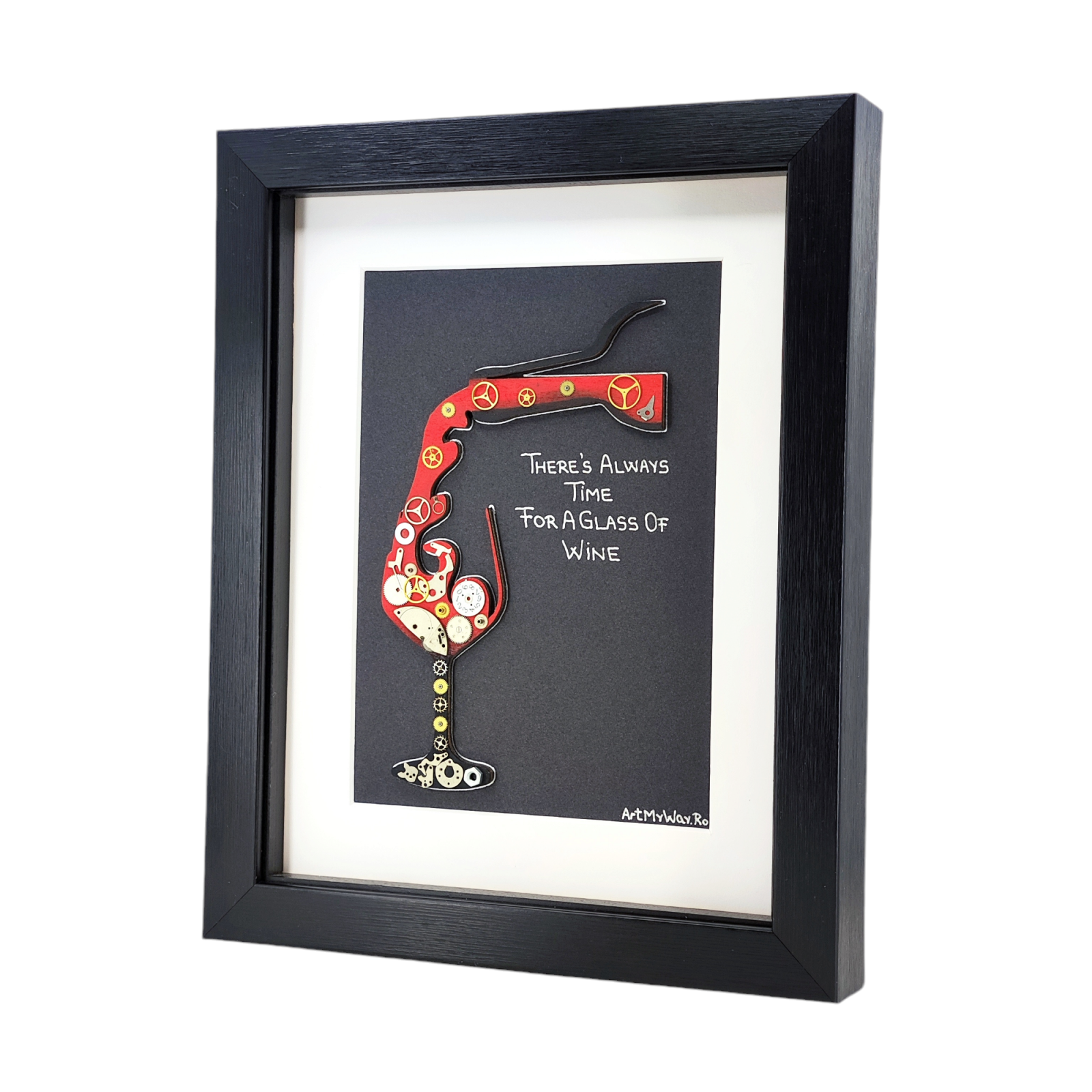 Tabloul There's Always Time For A Glass Of Wine este o declarație de dragoste față de una dintre cele mai rafinate plăceri ale vieții, transpusă într-un limbaj artistic tridimensional spectaculos. Realizat 100% manual în Colecția SteamWall, silueta unui pahar de vin umplut generos cu vin roșu este construită din mecanisme autentice reconditionate de ceas mecanic - rotițe, platine, axe și piese metalice diverse - pe un fundal negru mat care amplifică dramatismul compoziției. Mesajul emblematic este gravat cu eleganță pe același fond întunecat, completând tabloul.
