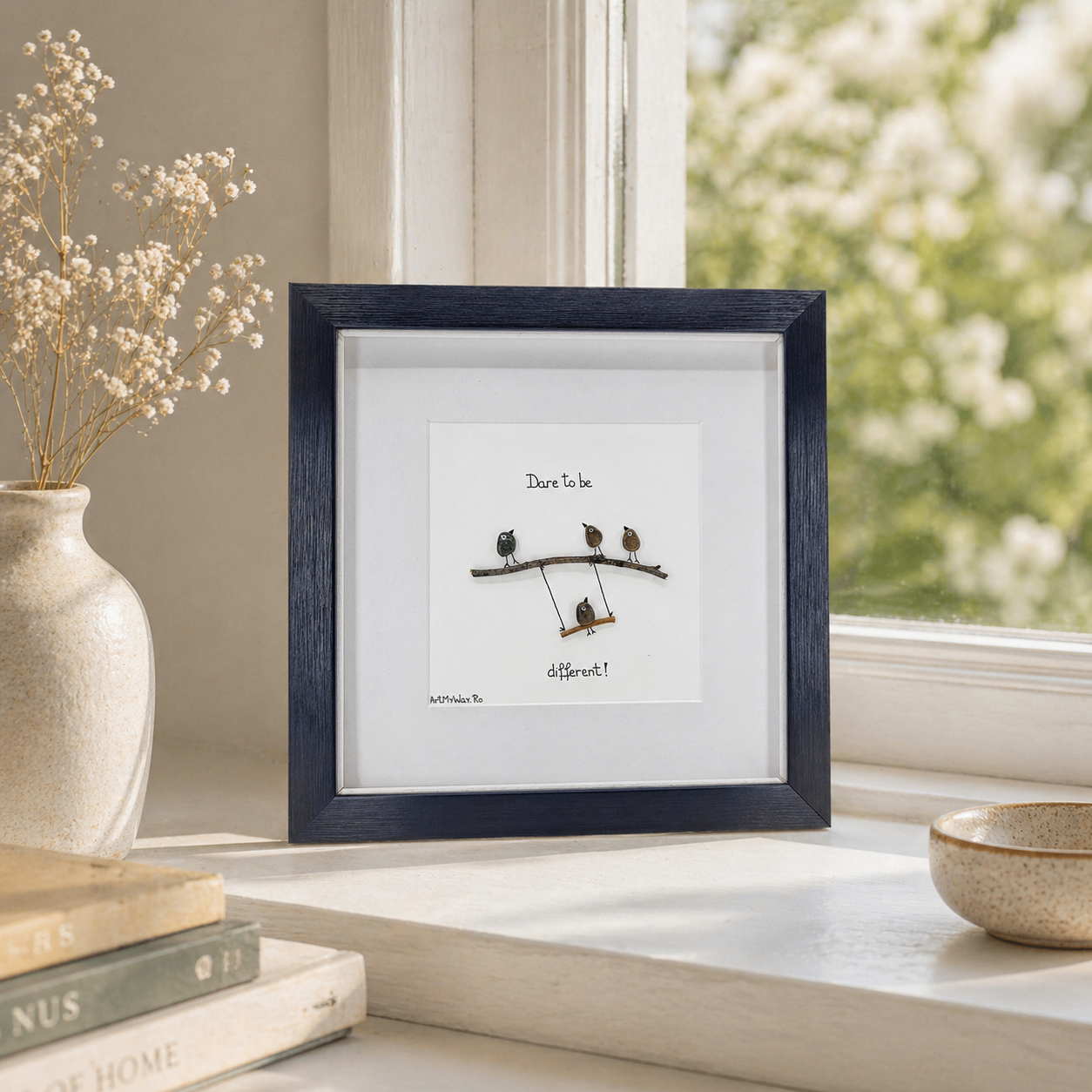 Cele mai interesante povești aparțin celor care au ales să fie altfel. Tabloul 'Dare to be Different (v2)' din Colecția Pebble Art este un îndemn vizual la autenticitate: realizat manual din pietre de râu de diferite dimensiuni, atent selectate, curățate și lăcuite, în varianta a doua care oferă o perspectivă vizuală diferită față de prima. Poate fi realizat în diverse culori, adaptat preferințelor personale.