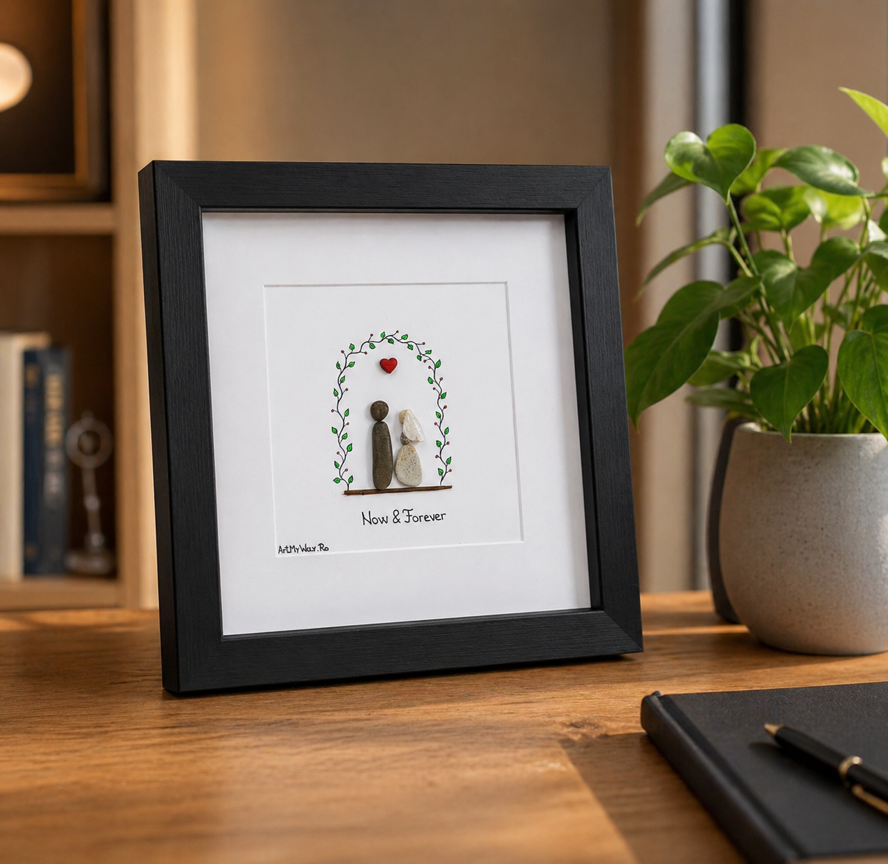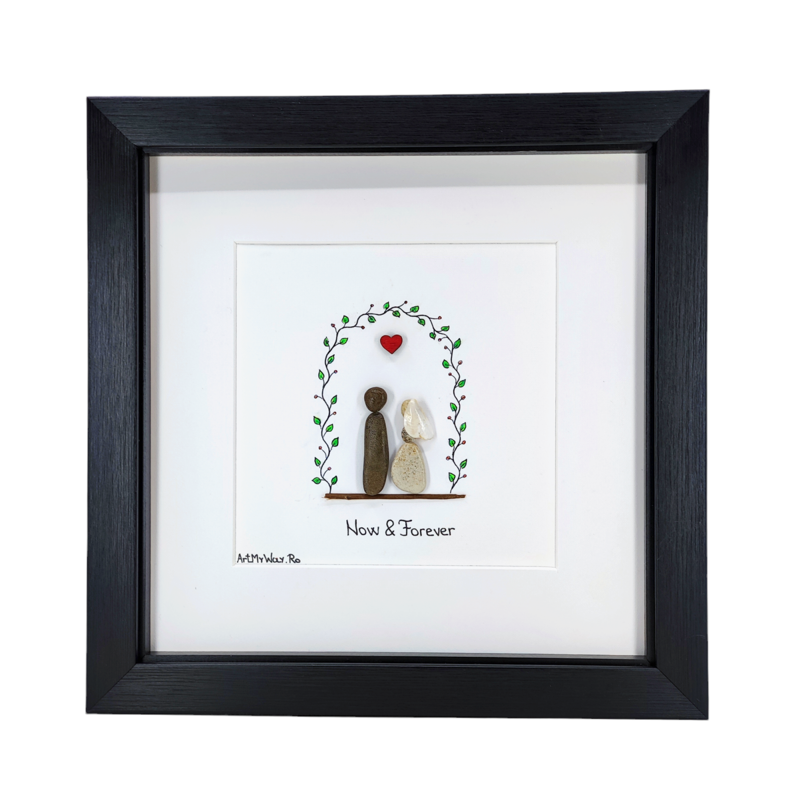 Tabloul Happily Ever After din Colecția Pebble Art celebrează iubirea eternă printr-o compoziție handmade din pietricele naturale - doi îndrăgostiți sub o arcadă de viță, cu o inimă roșie deasupra lor. Dimensiuni: 23,5×23,5 cm. Personalizare gratuită cu prenume sau dată specială. Certificat de autenticitate inclus.